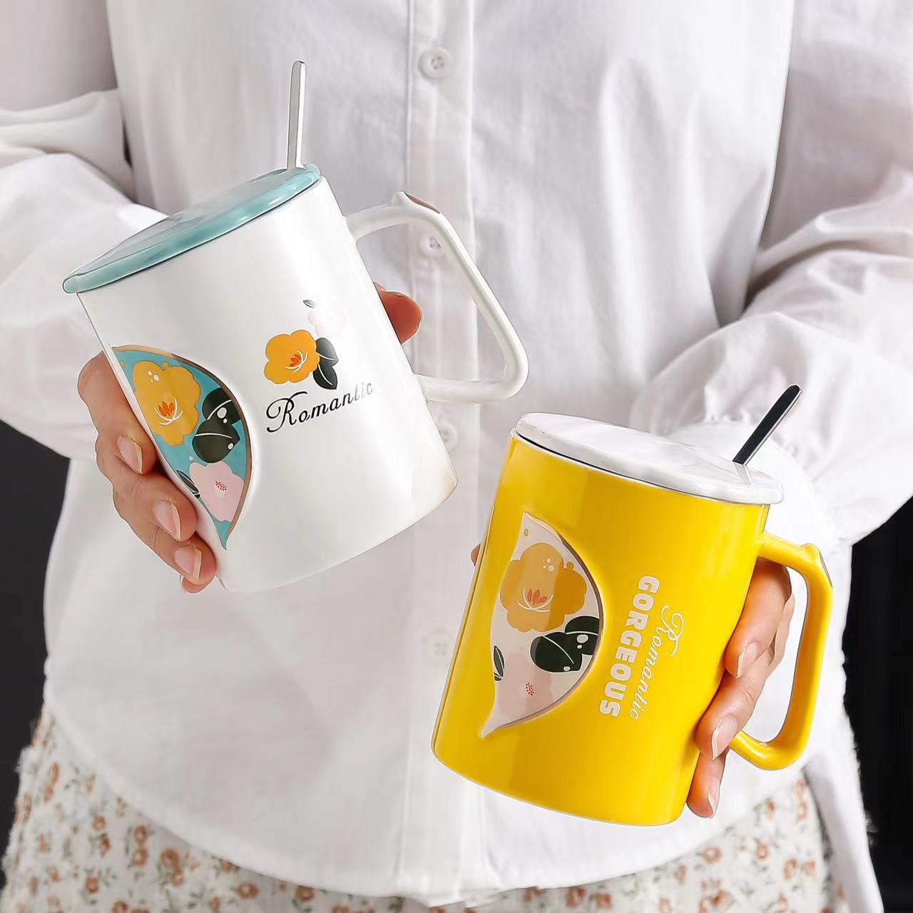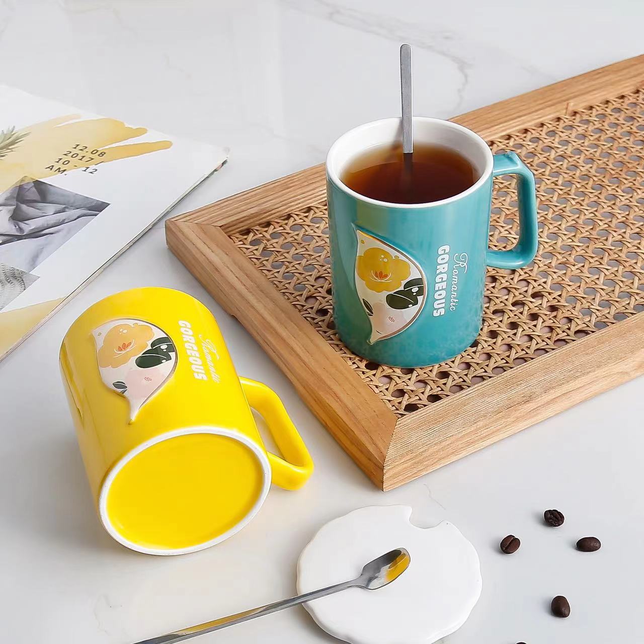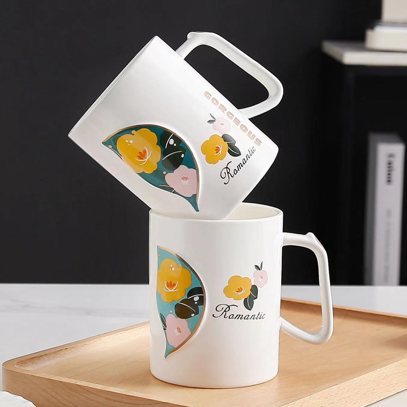 创意浮雕华丽浪漫花叶陶瓷杯带盖勺办公室家用咖啡牛奶杯伴手礼杯