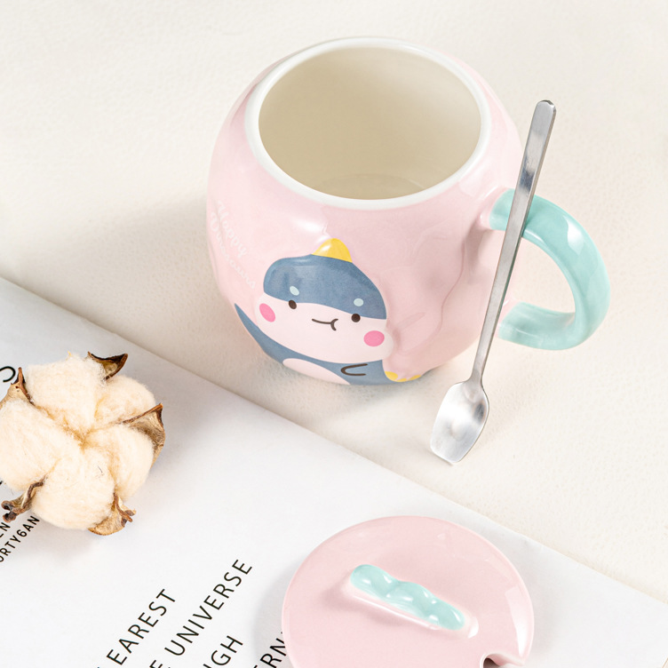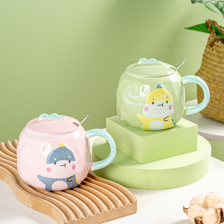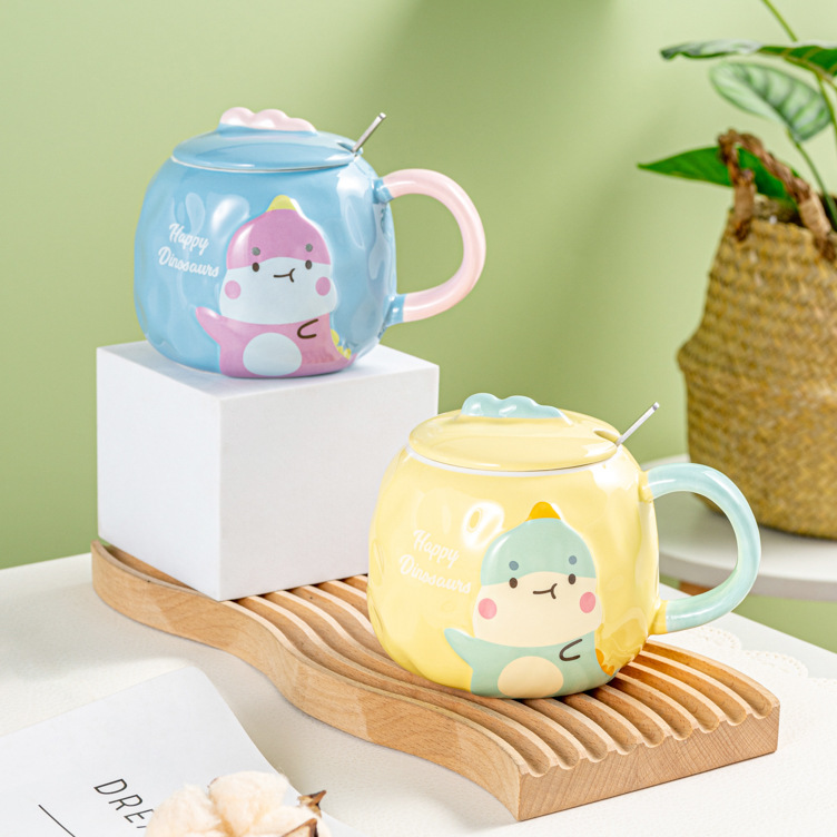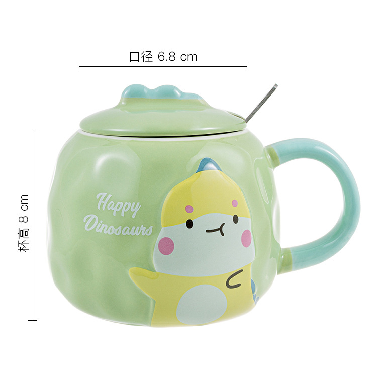 创意卡通恐龙陶瓷杯可爱ins礼品马克杯 情侣水杯咖啡杯带盖勺批发