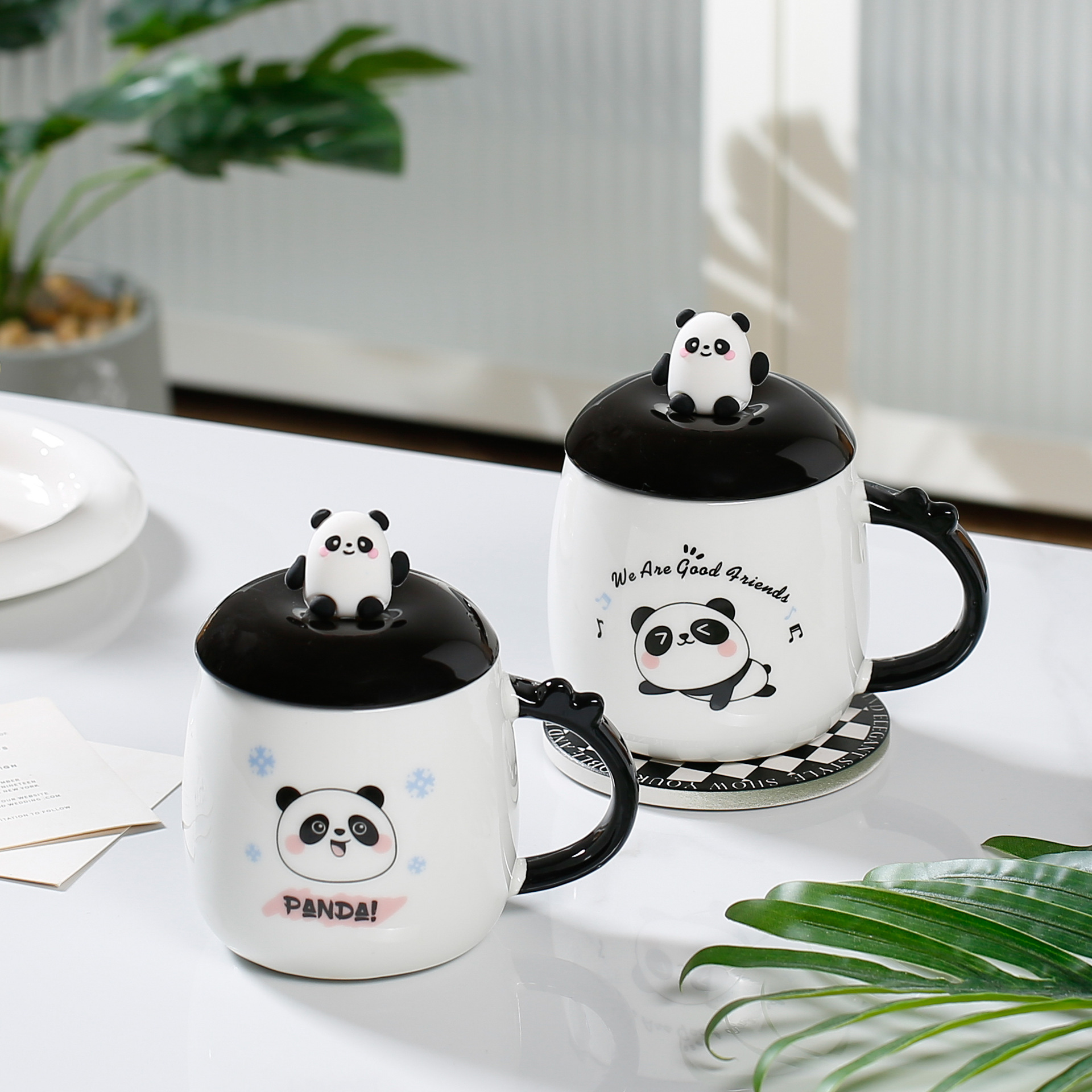 可爱卡通熊猫陶瓷杯创意黑白搭配马克杯配盖勺牛奶杯生日礼物