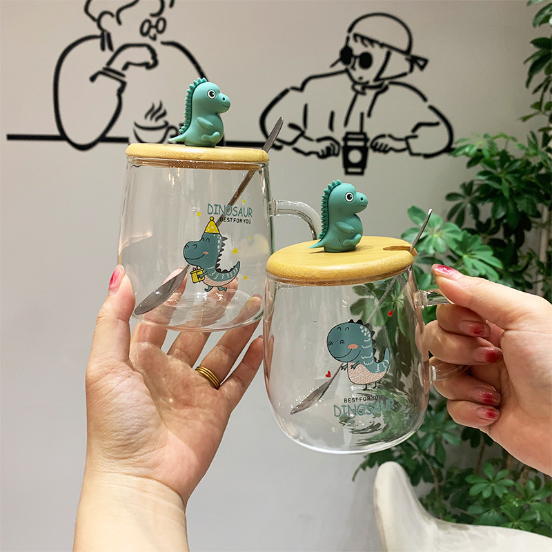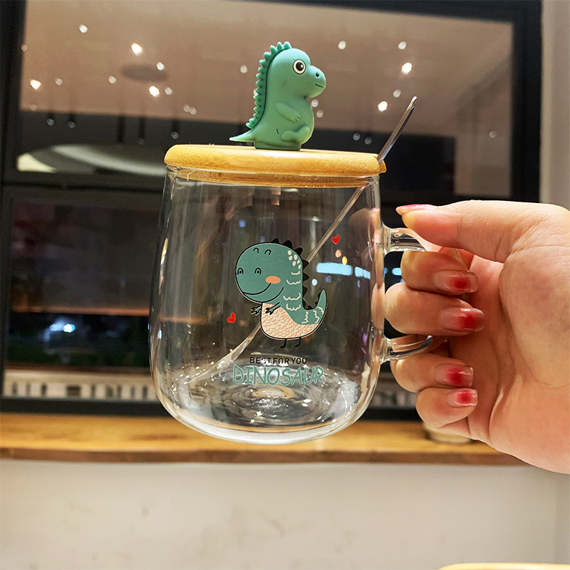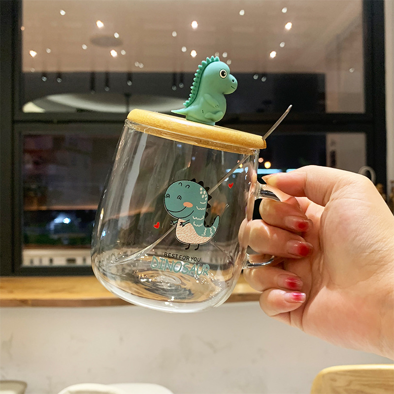 萌趣卡通小恐龙玻璃杯儿童带盖勺牛奶杯学生女早餐大肚水杯家用