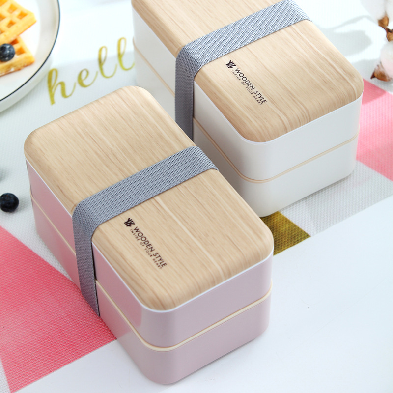 ins北欧风双层饭盒午餐盒木质感上班族学生便当盒便携可微波餐盒