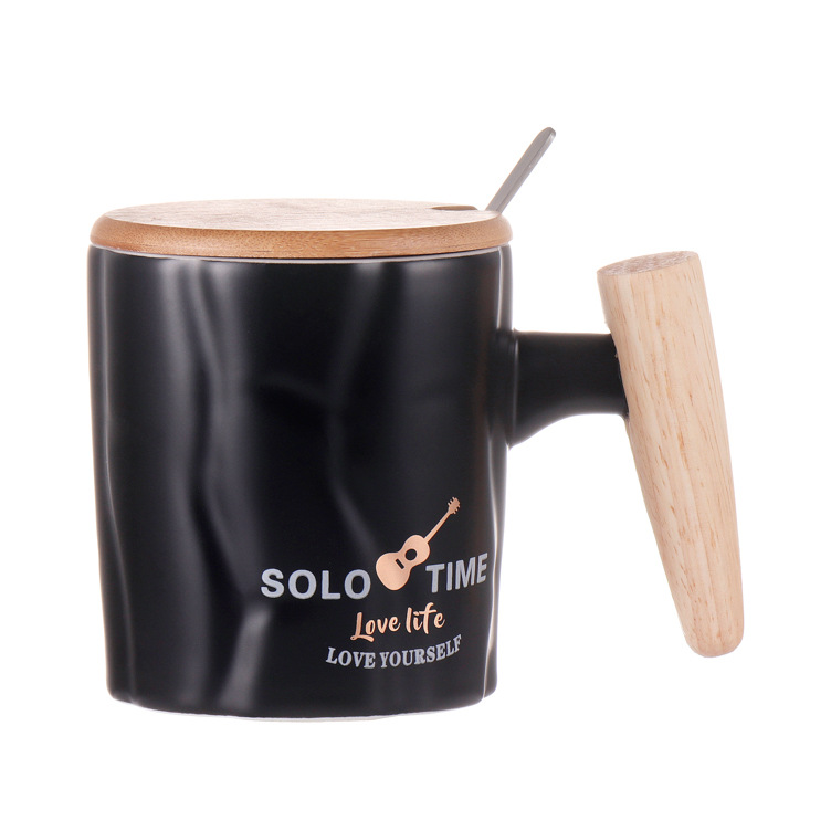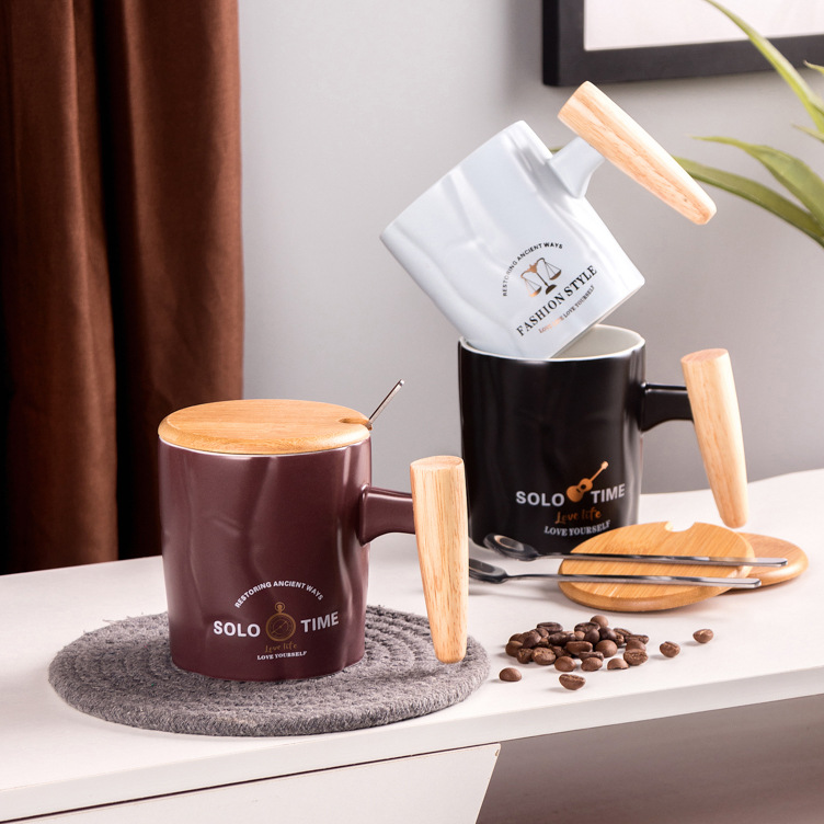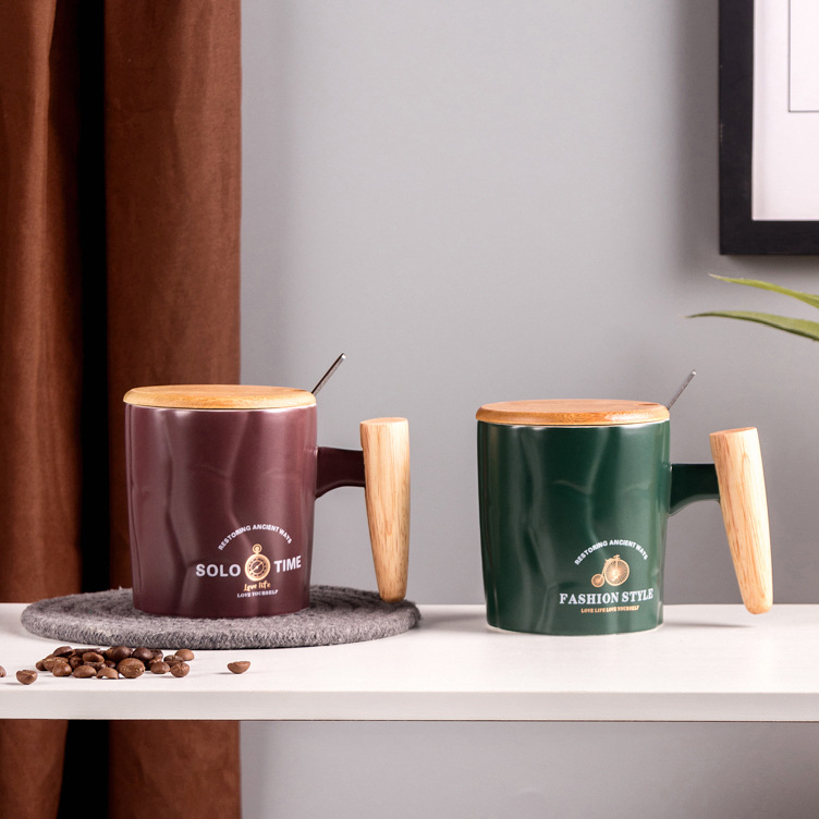 北欧风木手柄马克杯带盖子家用办公室茶杯陶瓷茶水杯大容量喝水杯
